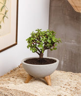 Bowl hecho a mano en fino concreto con patas fabricadas en madera natural (nogal). Perfecto para sembrar un jardín de suculentas, decorar tus espacios o sorprender a alguien más. Ideal para interiores o exteriores. Medidas: 10 cm alto x 16.5 cm diámetro (incluyendo las patas). Importante: no incluye...