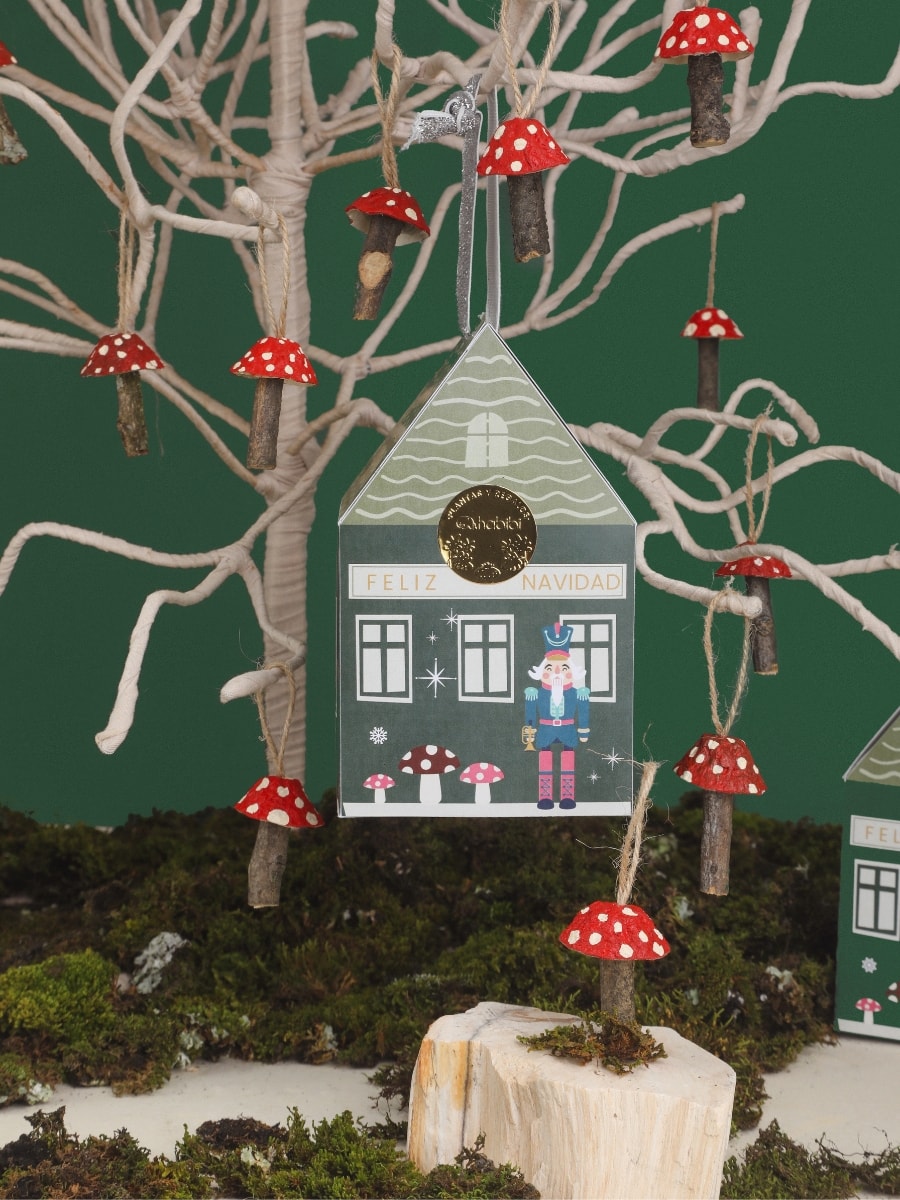 Esta casita incluye un pack x 8 amuletos de navidad en forma de hongo para colgar en el árbol y llevar vida a tus espacios en esta época especial. Cada hongo es una pieza única y diferente a las demás. Hechos a mano por dos artistas antioqueños a partir de la magia que tienen en sus manos, cajas de huevos y troncos de madera natural.