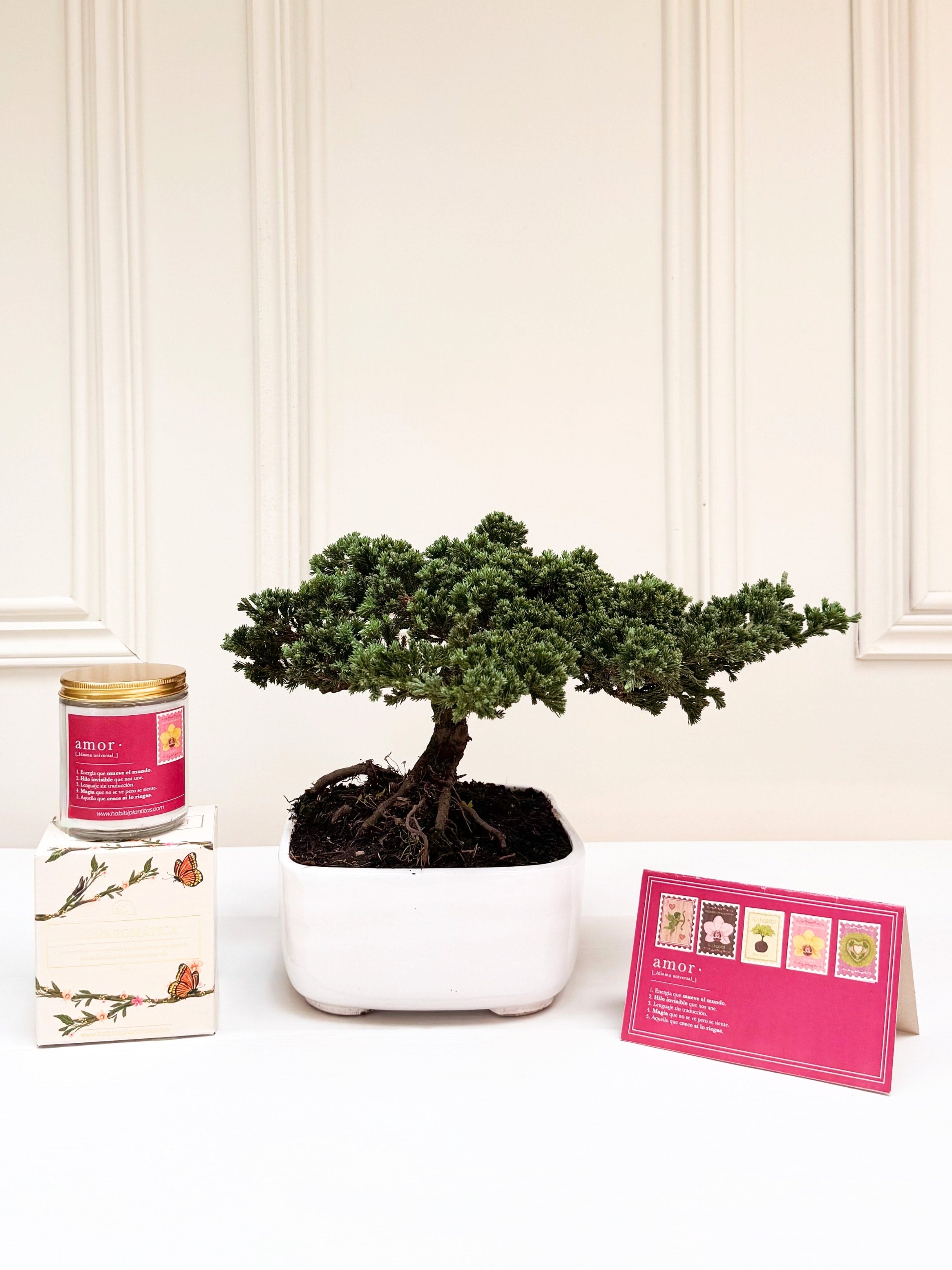 Kit con Bonsai de Pino Nana de 7 años de edad, planta de la eternidad, en matera en cerámica, toda una joya de la naturaleza, vela aromática con nuestra definición de Amor decorada con cuarzos intencionados, empaque de regalo y tarjeta de regalo de temporada de Amor y Amistad con un mensaje hermoso con nuestra definición de Amor. La tarjeta incluye un paquetico de semillas en el interior y un espacio en blanco para escribir tus mejores deseos, tu nos dejas el mensaje y nosotros lo escribimos por ti. ¡Todo empacado en una cajita de cartón hermosa y listo para...
