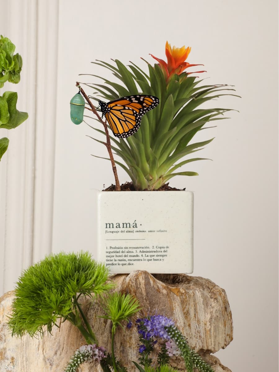 Mini Bromelia, planta de la hospitalidad, en matera en cerámica blanca pintada a mano con nuestra definición de Mamá. ¡Todo empacado en una cajita de cartón hermosa y listo para regalar! Todas las plantas vienen con un código QR que podrás escanear para conocer sus cuidados y aprender tips y trucos para que permanezcan hermosas.