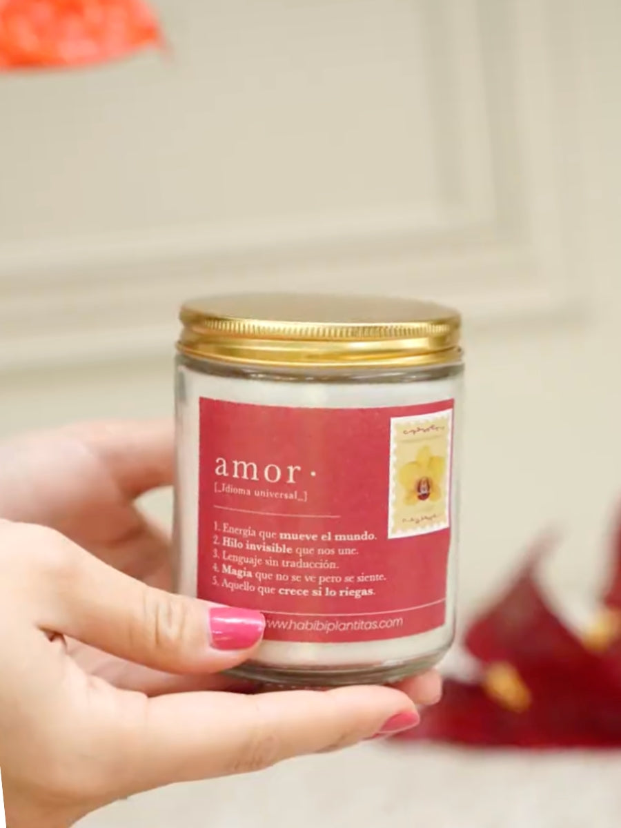 Esta vela aromática es una celebración del amor en su forma más pura. En su etiqueta encontrarás las palabras que le dan forma a ese idioma universal: la energía que mueve el mundo, el hilo invisible que nos une y la magia que crece si la riegas.