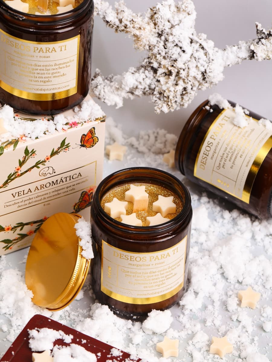 Vela aromática con fragancia a margaritas + rosas, decorada con estrellas y brillo dorado. Un detalle elegante y en su etiqueta, un deseo lleno de luz para celebrar la magia de la Navidad: "Que todos tus días estén iluminados por el sol y que en las noches las estrellas sean tu guía; tu presencia en este mundo es un regalo".
